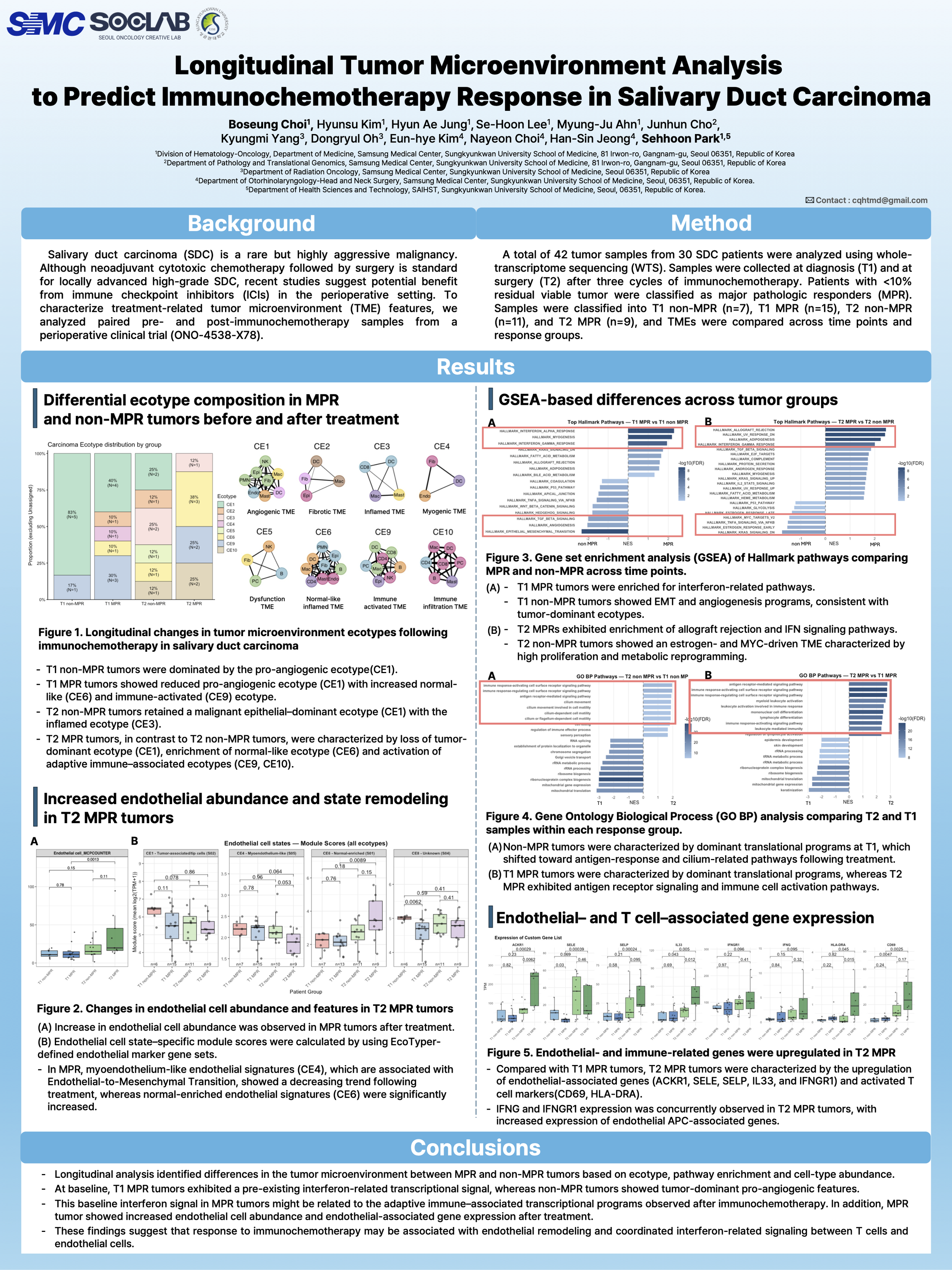Method : A total of 42 tumor samples from 30 SDC patients were analyzed using whole-transcriptome sequencing (WTS). Samples were collected at diagnosis (T1) and at surgery (T2) after three cycles of immunochemotherapy. Patients with <10% residual viable tumor were classified as major pathologic responders (MPR). Samples were classified into T1 non-MPR (n=7), T1 MPR (n=15), T2 non-MPR (n=11), and T2 MPR (n=9), and TMEs were compared across time points and response groups.