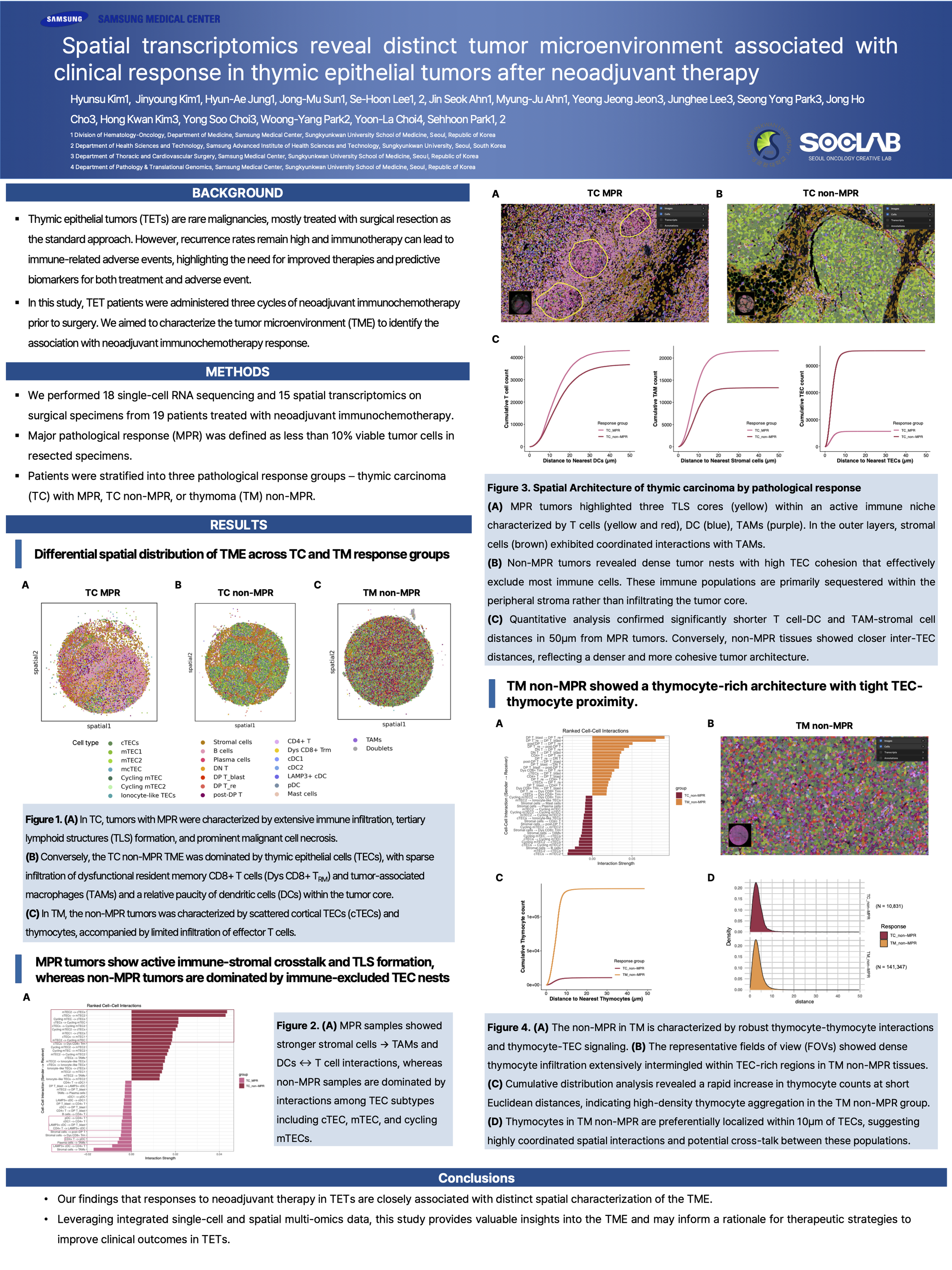 Methods: We performed 18 single-cell RNA sequencing and 15 spatial transcriptomics on surgical specimens from 19 patients treated with neoadjuvant immunochemotherapy. Major pathological response (MPR) was defined as less than 10% viable tumor cells in resected specimens. Patients were stratified into three pathological response groups ⎯ thymic carcinoma (TC) with MPR, TC non-MPR, or thymoma (TM) non-MPR.